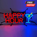 Neonetics Happy Hour Neon Sign. It features multi-colored, hand blown neon tubing. The base has an on and off switch, and can be adapted to sit on a shelf or hang on a wall. Neonetics neon signs have a warm mesmerizing glow, and are powered by industrial strength transformers, which operate silently and more efficiently than incandescent bulbs. All you do is hang it up and plug it in – no assembly or special wiring required.