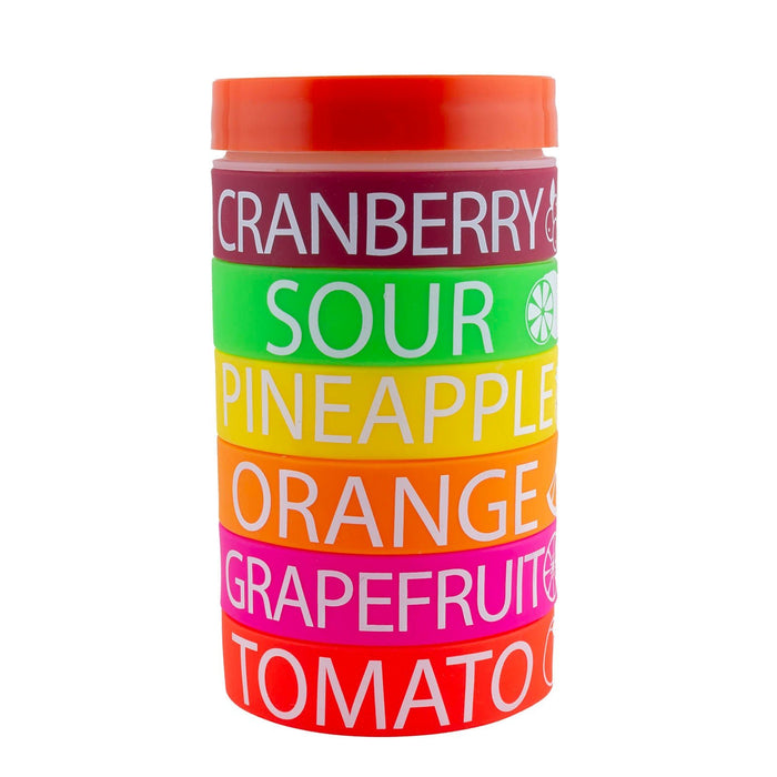 Want to label your juice containers in a long lasting efficient fashion? These 6 BarConic® Juice Container Bands are certainly a great and ideal addition to your bar or restaurant supplies to place on carafes or juice containers to label and identify different juices used for cocktails. Servers and bartenders won’t have to guess any longer what drink mixes are in each container. Unlike paper or sticker labels, these rubber bands can be easily removed or cleaned allowing for less food particles or bacteria to be harbored. Add this convenient set to quickly identify and effectively pour or store a variety of drink mixes and freshly squeezed juices.