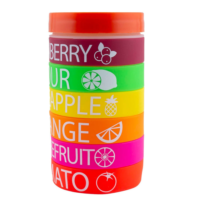Each band is approximately 3 ½ Inches in diameter. Manufactured from a thick rubber like material, these bands will definitely provide your bar or restaurant with a long lasting product. These bands are labeled as Sour, Orange, Tomato, Cranberry, Pineapple, and Grapefruit.